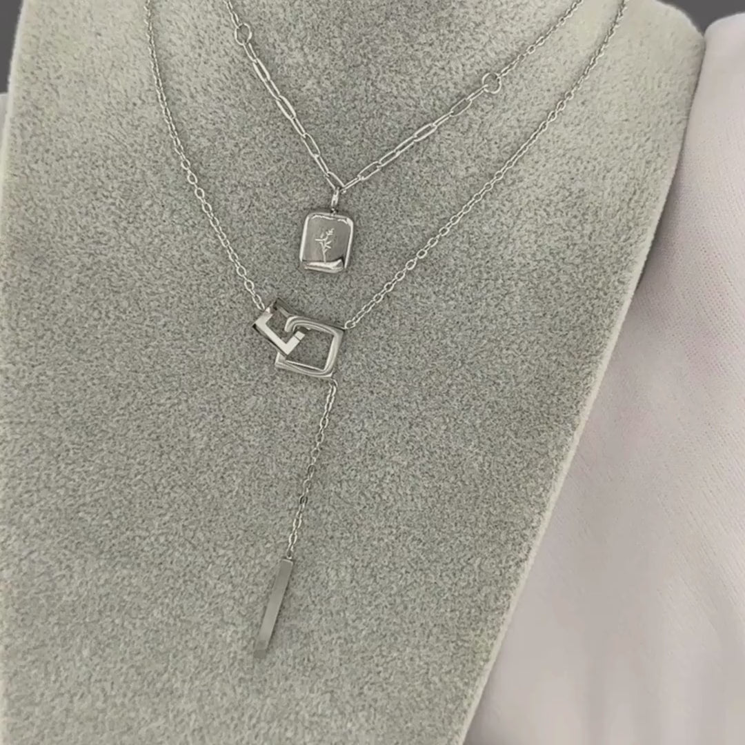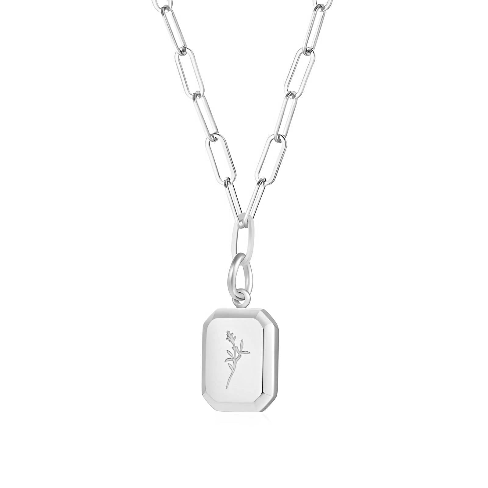 Stainless steel necklace featuring a rectangular pendant engraved with a minimalist flower. Clean, understated, and designed for everyday wear with a subtle edge.